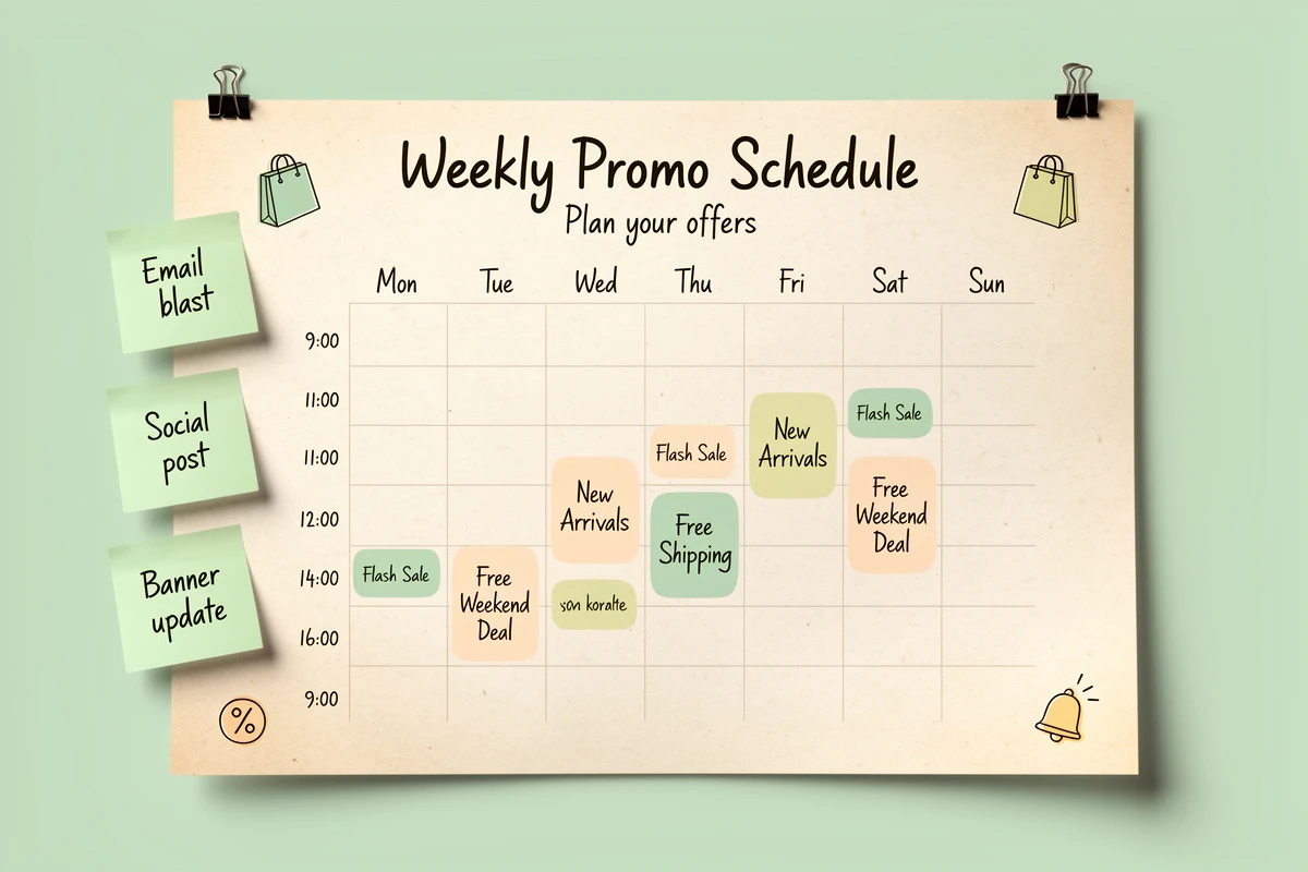 Tell customers about the schedule. A recurring promotion only builds habits if people know the schedule exists. Mention it in email footers, product pages, and social media. "Free shipping every weekend" is a compelling reason to follow your brand.