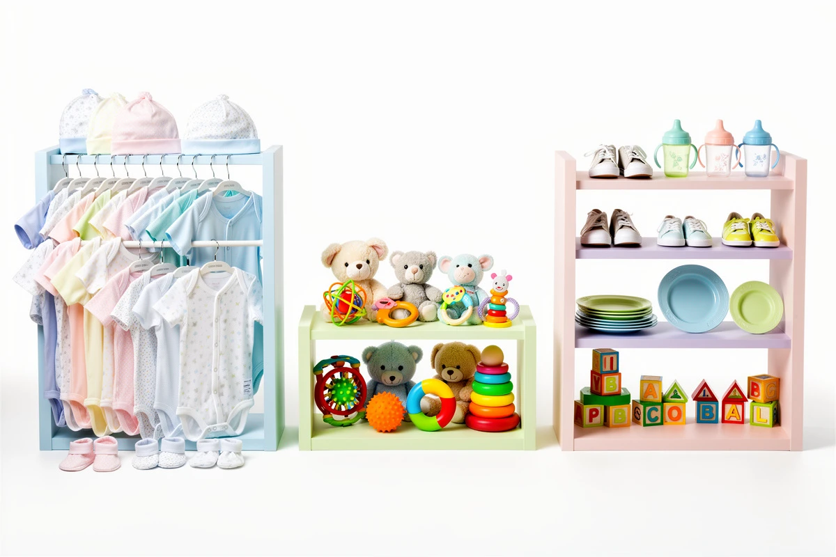 Newborn (0-3 months): Formula or bottles → Burp cloths, pacifiers, diaper cream, sleep sacks Infant (3-12 months): Baby food or teething toys → Bibs, sippy cup starters, highchair accessories, baby gates Toddler (1-3 years): Training pants or toddler toys → Potty training seats, safety locks, educational toys, toddler bedding